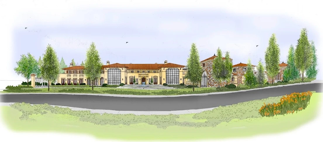 Pending project under construction. A professional rendering of a 16th-century Tuscan home design, featuring a stone façade, terracotta-tiled roof, and arched windows with wooden shutters. The planned layout includes a courtyard, surrounded by lush greenery. This visual showcases the warm, earthy tones and period-accurate details for a company specializing in historically inspired Tuscan architecture.